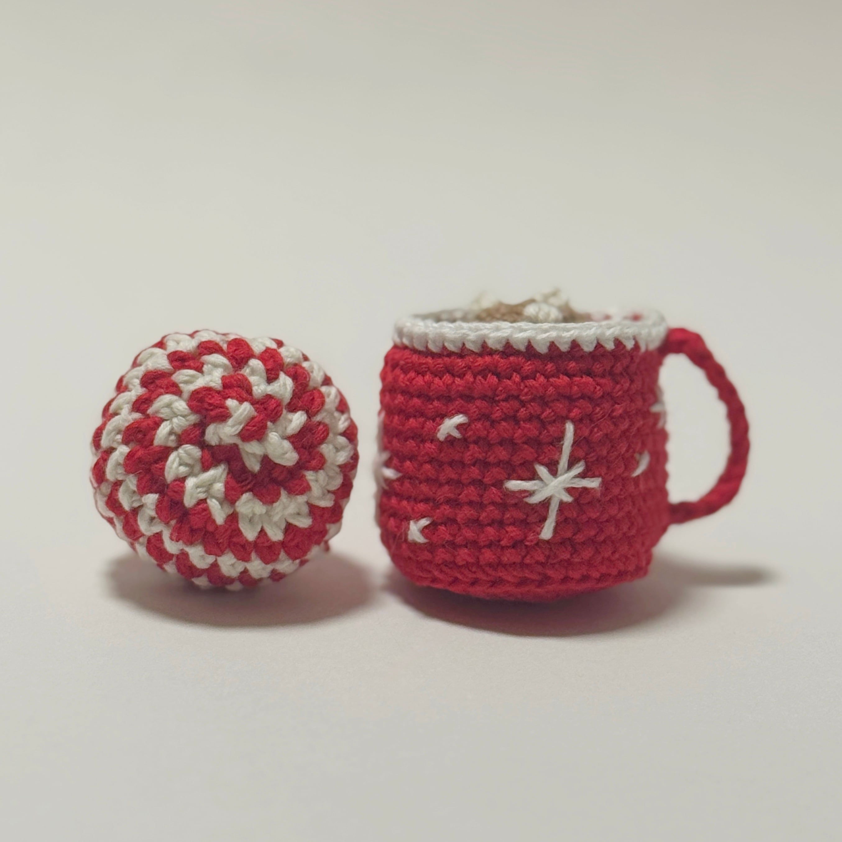 ペパーミントの飴玉にインスパイアされたころんとしたボールと、マシュマロ載せたココア色マグカップ型の編みぐるみ。猫とのほっこりした時間に寄り添います。